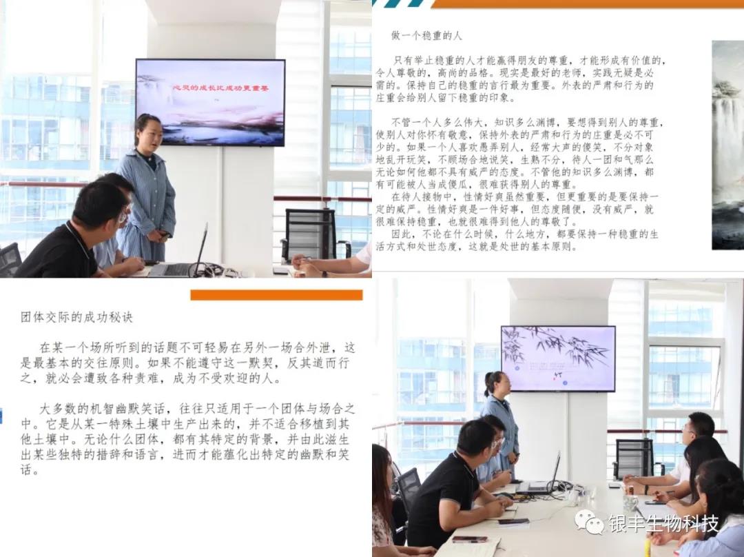 七月流火,八月未央。在這“芙蓉露下落,楊柳月中疏”的清秋時節,山東銀豐生物科技有限公司創建和打造學習型團隊系列活動之銀豐大講堂第十九場讀書會如期而至,持續以豐富的精神食糧來堆滿我們求知的谷倉。